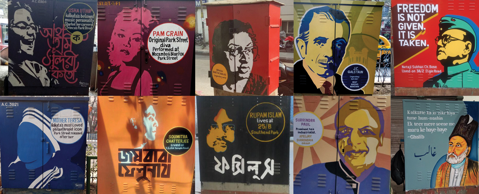 The movement widened its footprint across various Kolkata streets – Southend Park (where electricity box artworks celebrated residents like SD and RD Burman as well as Rupam Islam), Park Street (where artworks celebrated Surrendra and Jit Paul, Mother Teresa, Pam Crain, Louis Banks, Biddu, Flury’s, SkyRoom as well as educationists like Father Bouche and Father Joris of St Xavier’s) and Mirza Ghalib Street (where artworks celebrated the poet after whom the road was named).